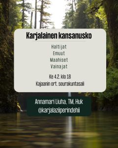 Annamari Liuhan suositut luennot karjalaisesta kansanuskosta jatkuvat jälleen 4.2. klo 18 teeillan yhteydessä seurakuntasalilla Kajaanissa.