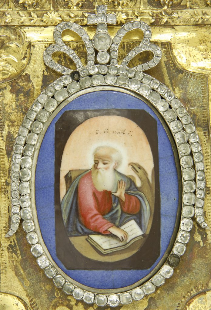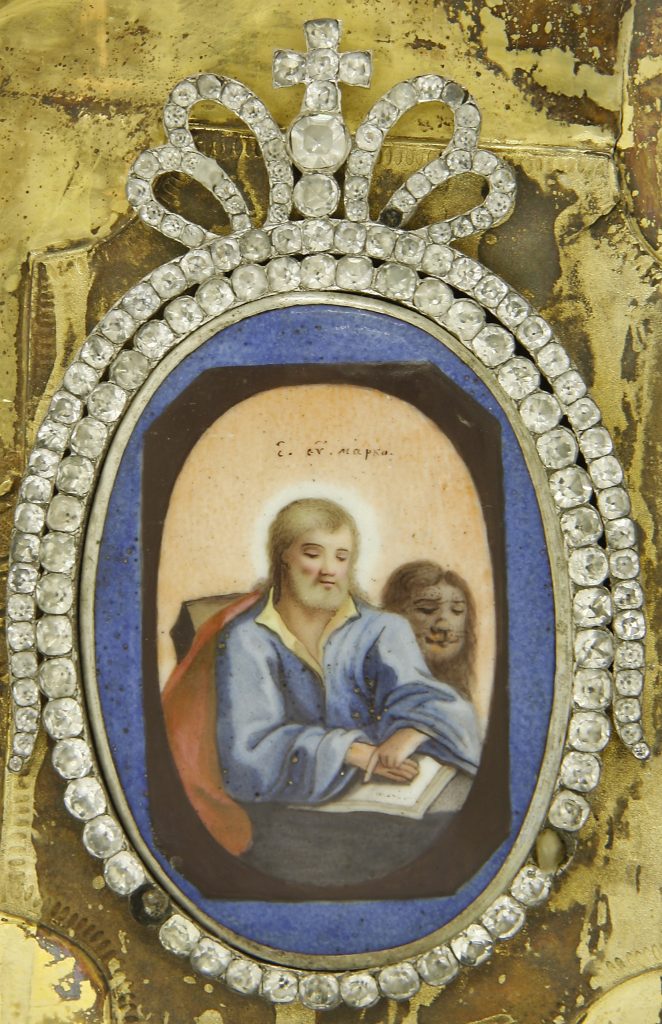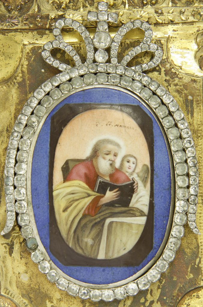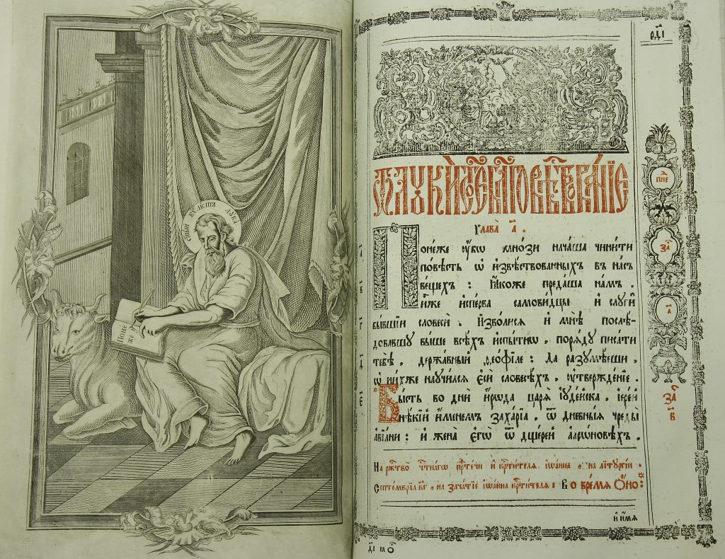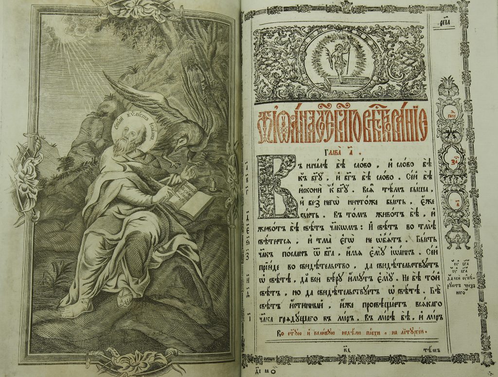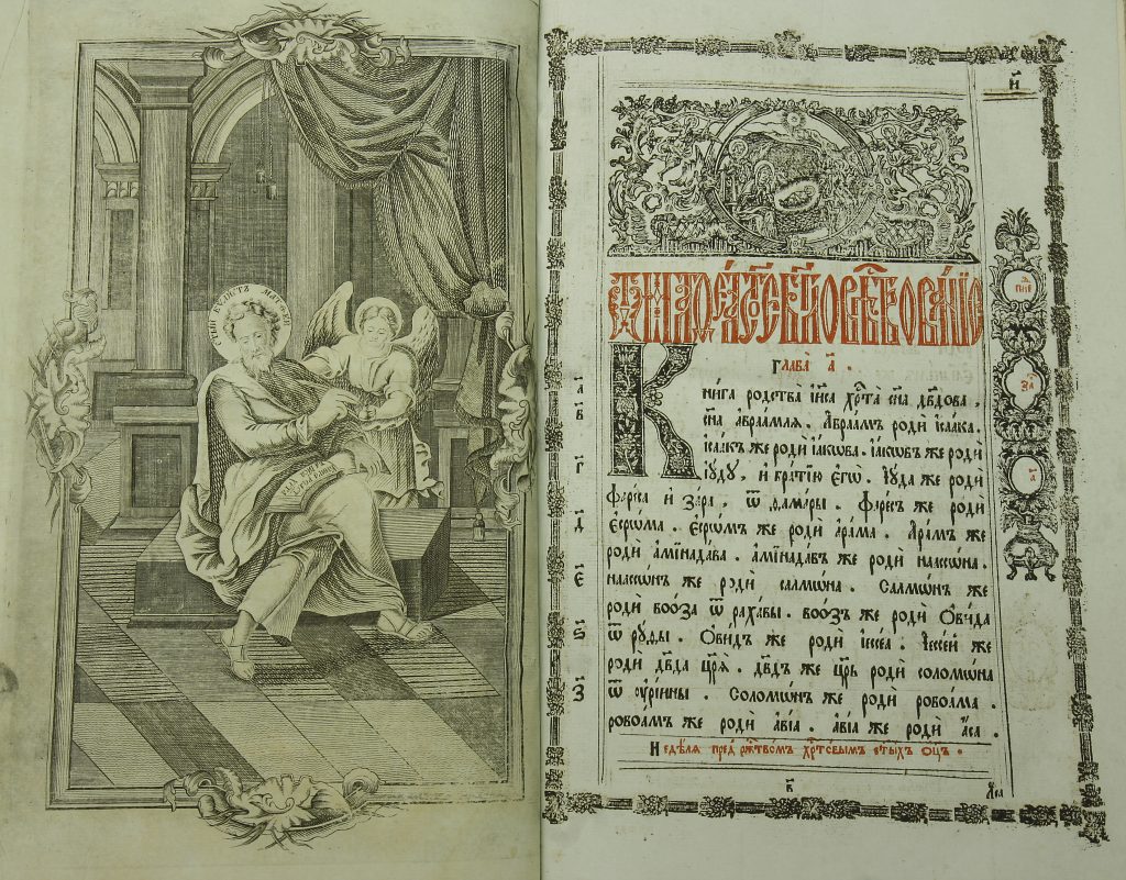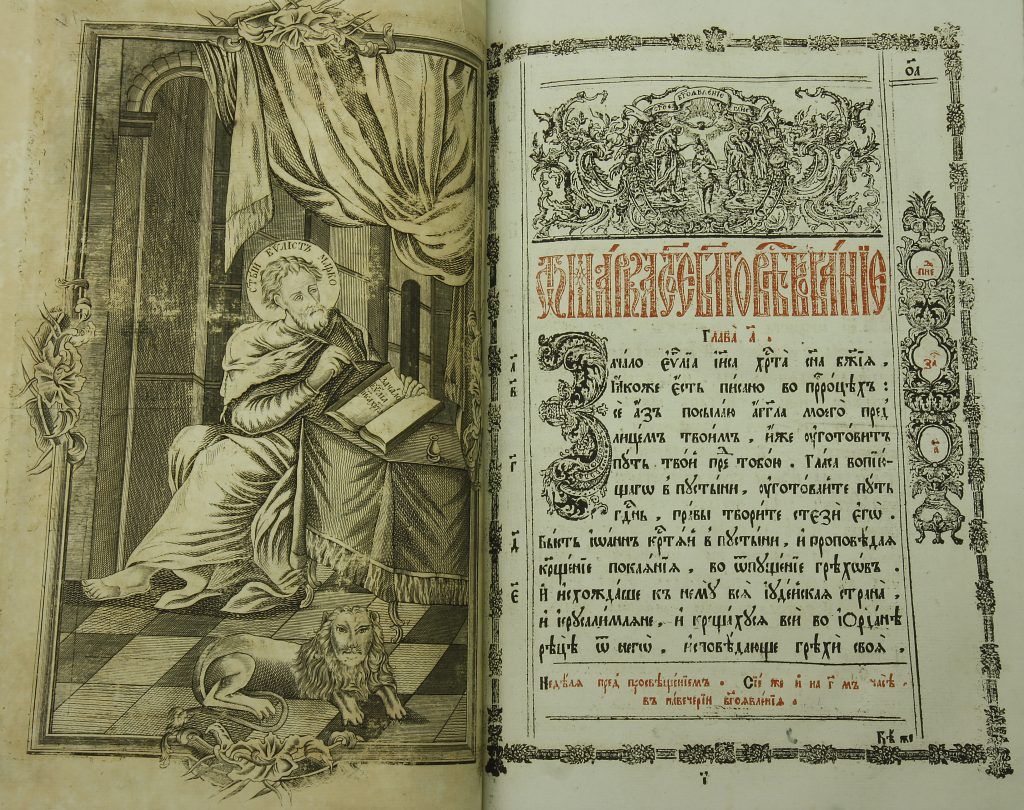 Kuvat: Evankeliumikirjan kansi ja alkulehtiä 1800-luvun evankeliumikirjasta Suomen ortodoksisen kirkkomuseon kokoelmista.
