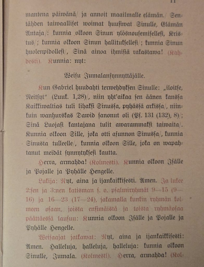 Valitettavasti on tässä yhteydessä todettava, että Raamattuakin voidaan kääntää monella tavalla. Suomalaiset kääntäjät ovat viisaita ja oppineita, osaavat vanhaa kreikkaa ja vaikka mitä, ja niinpä he ovat kääntäneet kohdan toisella tavalla, mutta esimerkiksi ensimmäisen hetken loppurukouksessa saamme vieläkin kuulla oikean käännöksen: